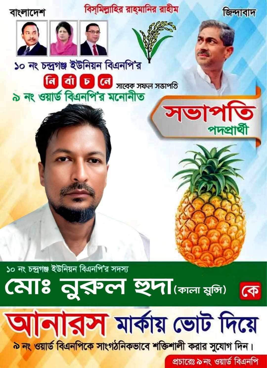 এ প্রেক্ষাপটে ১০নং চন্দ্রগন্জ ইউনিয়ন ৯নং ওয়ার্ড বিএনপির সভাপতি পদপ্রার্থী মো:নুরুল হুদা(কালামুন্সি) ছাএ রাজনৈতি থেকে উঠে আসা এই নেতা দীর্ঘদিন ধরে বিএনপির রাজনৈতির সাথে নিবিড়ভাবে জড়িত। ক্লিন ইমেজের অধিকারী এই সাবেক বিএনপির নেতা সততা, সাংগঠনিক দক্ষতা ও ত্যাগের পরিচয় দিয়েছেন বিভিন্ন সময়।বর্তমানে তিনি ৯নং ওয়ার্ড বিএনপিকে আরো সুসংগঠিত ও শক্তিশালী করার লক্ষ্যে মাঠে সক্রিয় রয়েছেন। নেতাকর্মীদের স্বার্থই আমার মূল লক্ষ্য।যদি নেতাকর্মীরা আমাকে সমর্থন করেন,তাহলে আমি ৯ ওয়ার্ড বিএনপিকে একটি মডেল ওয়ার্ড কমিটি গড়ে তুলবো ইনশাআল্লাহ।১০ নং চন্দ্রগন্জ ইউনিয়ন ৯নং ওর্য়াড বিএনপির সভাপতি পদপ্রার্থী