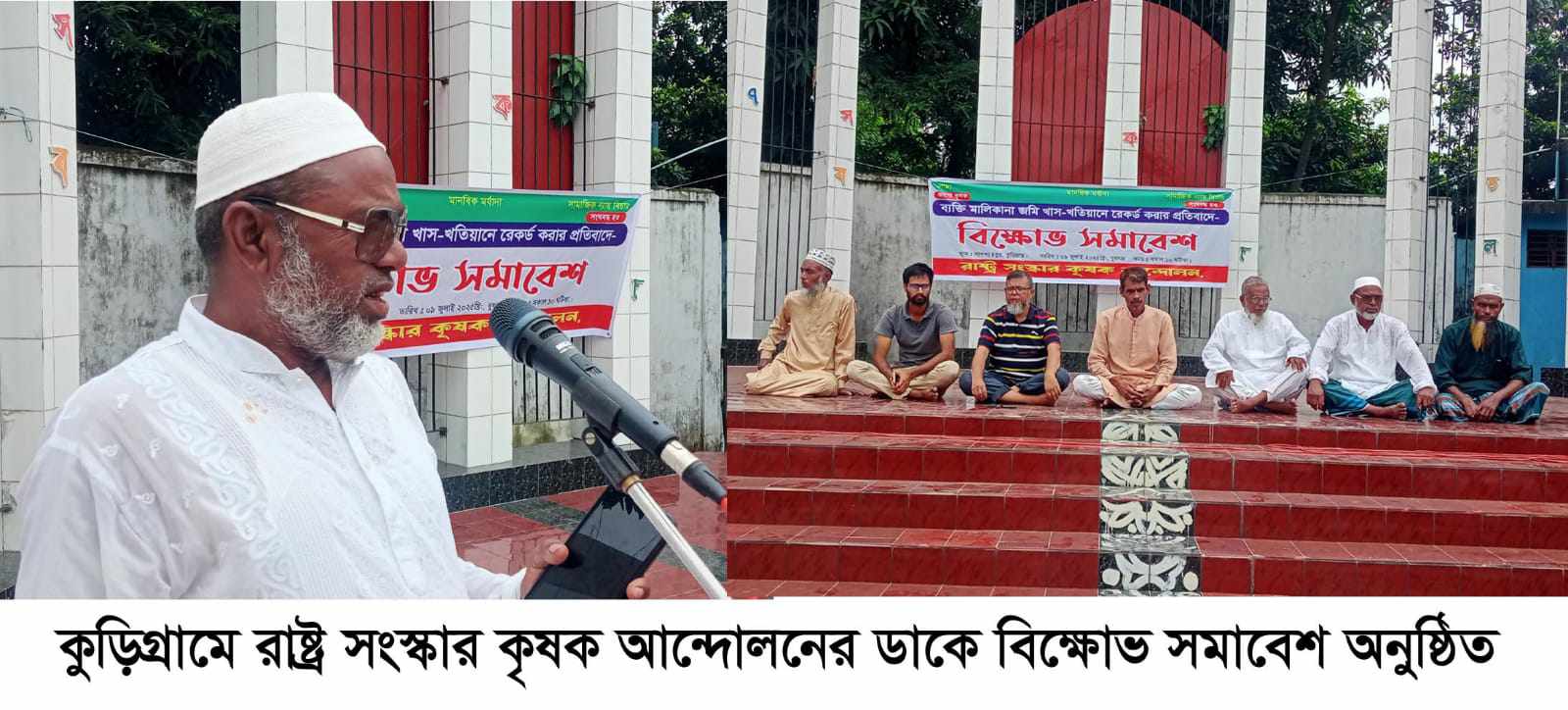 ব্যক্তি মালিকানাধীন জমিকে খাস খতিয়ানে রেকর্ড করার ষড়যন্ত্রের প্রতিবাদে আয়োজিত এই সমাবেশে সভাপতিত্ব করেন রাষ্ট্র সংস্কার কৃষক আন্দোলনের কুড়িগ্রাম জেলা কমিটির আহ্বায়ক আরিফুল ইসলাম জুয়েল।