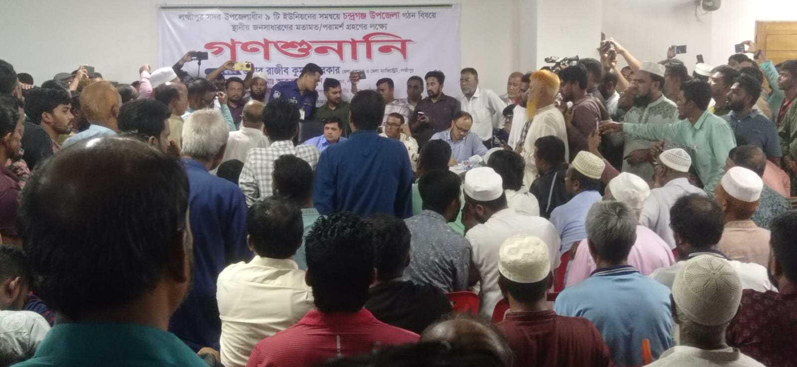 লক্ষ্মীপুর সদর উপজেলাধীন নয়টি ইউনিয়ন নিয়ে চন্দ্রগঞ্জ থানাকে উপজেলা গঠনের প্রস্তাবনাকল্পে স্থানীয় জনসাধারনের মতামত গ্রহণে গণশুনানি অনুষ্ঠিত হয়েছে। বৃহস্পতিবার (১০ জুলাই ) দুপুর সদরের বটতলী বাজার উপজেলা মডেল মসজিদ হলরুমে এ গণশুনানি অনুষ্ঠিত হয়। এতে প্রাথমিকভাবে উপজেলা প্রশাসনিক কার্যালয় হিসেবে বটতলীকে প্রাধান্য দেয়া হয়েছে। সদর উপজেলা প্রশাসন আয়োজিত অনুষ্ঠানে প্রধান অতিথি ছিলেন জেলা প্রশাসক রাজিব কুমার সরকার। বিশেষ অতিথি ছিলেন পুলিশ সুপার আকতার হোসেন, স্থানীয় সরকার উপ-পরিচালক মোঃ জসীম উদ্দিন, উপজেলা নির্বাহী কর্মকর্তা জামশেদ আলম রানা, সদর থানা অফিসার ইনচার্জ আব্দুল মোন্নাফ,চন্দ্রগঞ্জ থানা ইনচার্জ ফয়জুল আজীম, উপজেলা ভূমি সহকারী কর্মকর্তা অভি দাস সহ বিভিন্ন পর্যায়ের কর্মকর্তাবৃন্দ। গণশুনানীতে স্থানীয় জনপ্রতিনিধি, রাজনৈতিক ব্যক্তিত্ব, শিক্ষাবিদ, সাংবাদিক, সুশীল সমাজের প্রতিনিধি ও এলাকাবাসী অংশ নেয়। উপস্থিত ব্যক্তিবর্গ জেলা প্রশাসকের নিকট ভৌগোলিক বিস্তৃতি, জনসংখ্যার ঘনত্ব, শিক্ষা-স্বাস্থ্য, অবকাঠামো এবং অর্থনৈতিক সম্ভাবনার কথা তুলে ধরে মধ্যবর্তী স্থানে একটি পূর্ণাঙ্গ উপজেলা পরিষদ নির্মানের প্রস্তাবনা করেন। উপজেলার অধীনে রয়েছে ৭নং বশিকপুর, ৮ নং দত্তপাড়া,৯ নং উত্তর জয়পুর,১০ নং চন্দ্রগঞ্জ, ১১নং হাজীরপাড়া,১২ নং চরশাহী,১৩ নং দিঘলী, ১৪নং মান্দারী ও ১৮ নং কুশাখালী ইউনিয়ন। উপস্থিত ব্যক্তিবর্গের মতামত সরকারকে জানানো হবে বলে ব্যক্ত করে গণশুনানীর প্রধান অতিথি জেলা প্রশাসক রাজীব কুমার সরকার। সংশ্লিষ্ট কর্তৃপক্ষের দৃষ্টি আকর্ষণ করে দ্রুত সময়ের মধ্যে চন্দ্রগঞ্জকে উপজেলা ঘোষণা হবে।