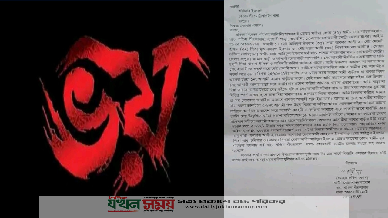 গত ১০ অক্টোবর ২২ইং রংপুর জেলা নারী শিশু নির্যাতন ট্রাইব্যুনাল-১ এর মামলা নং ১৩৯/২২ এর নারী ও শিশু নির্যাতন আইনের ১০ ধারা দণ্ডবিধি ৪৪৭/৪৪৮/৩২৩/৪২৭/৫০৬, আসামী ১-আরিফুল ইসলাম (৩৫) পিতা আকবর আলী,২- মেহেদী হাসান (২২) পিতা মৃত নজরুল ইসলাম, ৩-রঞ্জন আলী (৩০) পিতা মমদেল হোসেন, ৪-রুজিনা বেগম (৩০) স্বামী আরিফুল ইসলাম, সর্ব সাং পশ্চিম পীরজাবাদ কোতোয়ালি রংপুর।