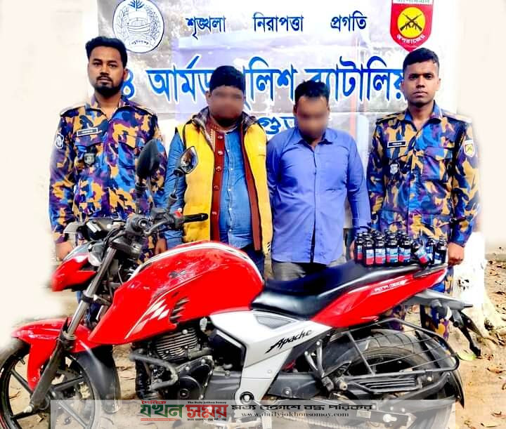 ৪ আমর্ড পুলিশ ব্যাটালিয়ানের অধিনায়ক এ্যাডিশনাল ডিআইজি আবু সায়েম স্বাক্ষরিত প্রেস বিজ্ঞপ্তিতে এ তথ্য জানা গেছে। গ্রেপ্তারকৃতরা হলেন- বগুড়ার শেরপুর উপজেলার কুসুম্বী ইউনিয়নের দ্বাড়কীপাড়া গ্রামের সাবেক ইউপি সদস্য মৃত আলেফ শেখের ছেলে মো. পুটু মিয়া ও দিনাজপুরের নবাবগঞ্জের কুশদহ হিলিডাঙ্গা বাজারের মৃত ভূপেনচন্দ্র রায়ের ছেলে প্রদীপ রায়। অভিযানকালে তাদের নিকট থেকে ২০ বোতল ফেন্সিডিল এবং ১টি মোটর সাইকেল উদ্ধার করা হয়েছে। তাদের বিরুদ্ধে মাদকদ্রব্য নিয়ন্ত্রণ আইনে মামলা দিয়ে বগুড়া সদর থানায় সোপর্দ করা হয়েছে।