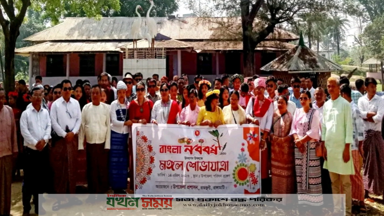 রাঙামাটি পার্বত্য জেলার রাজস্থলীতে বাঙ্গালির প্রাণের উৎসব বাংলা নববর্ষ উৎসব মুখর পরিবেশে উদযাপিত হয়েছে।শুক্রবার (১৪ এপ্রিল) সকালে উপলক্ষে উপজেলা প্রশাসনের উদ্যোগে উপজেলা পরিষদ কার্যালয় প্রাঙ্গণ থেকে একটি বর্ণাঢ্য মঙ্গল শোভাযাত্রা বের হয়। শোভাযাত্রা টি উপজেলার উত্তর দক্ষিণ দিক প্রদিক্ষণ করে পুনরায় উপজেলা চত্বরে এসে শেষ হয়। শোভাযাত্রায় উপস্থিত ছিলেন রাজস্থলী উপজেলা চেয়ারম্যান উবাচ মারমা।এ সময় উপস্থিত ছিলেন উপজেলা নির্বাহী কর্মকর্তা শান্তনু কুমার দাশ, ভাইস চেয়ারম্যান অংনুচি মারমা, মহিলা ভাইস চেয়ারম্যান উচসিন মারমা, উপজেলা স্বাস্থ্য ও পরিবার পরিকল্পনা কর্মকর্তা ডাঃ রুইহ্লা অং মারমা, উপজেলা আনসার ভিডিপি কর্মকর্তা আবদুর ছাত্তার, উপজেলা শিক্ষা অফিসার তাজুরুল ইসলাম, ১ নং ঘিলাছড়ি ইউনিয়ন পরিষদের চেয়ারম্যান রবার্ট ত্রিপুরা, গাইন্দ্যা ইউপি চেয়ারম্যান পুচিংমং মারমা, মহিলা সভানেত্রী লংবতি ত্রিপুরা, উপজেলা আওয়ামী লীগের সাংগঠনিক সম্পাদক অংসুইনু মারমা,হারাধন কর্মকার,উথোইচিং মারমা, দিলীপ কুমার তংচঞ্চ্যা, শাক্যমিত্র তংচঞ্চ্যা, সহ অন্যান্যরা উপস্থিত ছিলেন।শোভাযাত্রায় বিভিন্ন রঙের পোশাক পরে নারী পুরুষ অংশগ্রহণ করে। এছাড়া ক্ষুদ্র নৃগোষ্ঠীর নারী-পুরুষও তাদের ঐতিহ্যবাহী নানা রঙের পোশাক পরে অংশগ্রহণ করে শোভাযাত্রায়।একদিকে বাঙ্গালির নববর্ষ পহেলা বৈশাখ অন্যদিকে ক্ষুদ্র নৃগোষ্ঠী সম্প্রদায়ের বর্ষবরণ বৈসাবি উৎসব চলছে একই সাথে রাজস্থলীতে। ফলে সম্প্রীতির মিলন মেলায় পরিণত হয়েছে পুরো রাজস্থলী উপজেলা এলাকা।