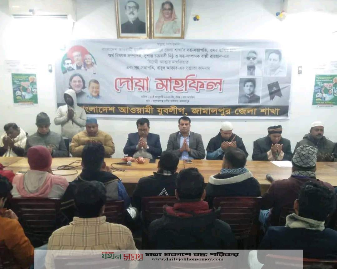 বাংলাদেশ আওয়ামী যুবলীগ জামালপুর জেলা শাখার সভাপতি রাজন সাহা রাজুর সভাপতিত্বে ও সাধারণ সম্পাদক ফারহান আহমেদের সঞ্চালনায় দোয়া মাহফিল