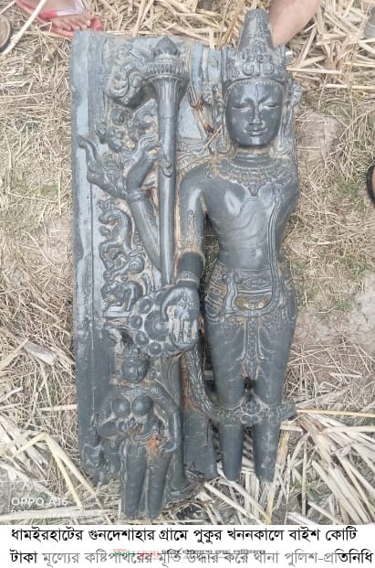ধামইরহাট থানার অফিসার ইনচার্জ মোঃ মোজাম্মেল হক কাজী বলেন, উপজেলার খেলনা ইউনিয়নের গ্রামের মোজাম্মেল হকের ছেলে, মোতালেব হোসেন নিজ জমিতে পুকুর খনন সময়ে একটি কষ্টিপাথরের নারায়ণ ঠাকুরের মূর্তি দেখতে পায়। তাৎক্ষণিক ধামইরহাট থানা পুলিশকে খবর দেয়। খবর পেয়ে থানার পরিদর্শক (তদন্ত) আব্দুল গনি, উপপরিদর্শক পরিতোষ সরকারসহ সঙ্গীয় ফোর্স নিয়ে ঘটনাস্থলে গিয়ে মূর্তিটি উদ্ধার করে থানায় হেফাজতে নেওয়া হয়। ৩২ কেজি ওজনের নারায়ণ ঠাকুরের মূর্তিটির মূল্য ২২ কোটি টাকা। ধারণা করা হয়েছে প্রাচীন এ মূর্তিটি হিন্দু সম্প্রদায়ের দেবতা ছিল। আদালতের নির্দেশনা মোতাবেক মূর্তিটি হস্তান্তরের ব্যবস্থা নেওয়া হবে। এ ব্যাপারে পুলিশের পক্ষ থেকে থানায় একটি সাধারণ ডায়েরি অন্তর্ভুক্ত করা হয়েছে।