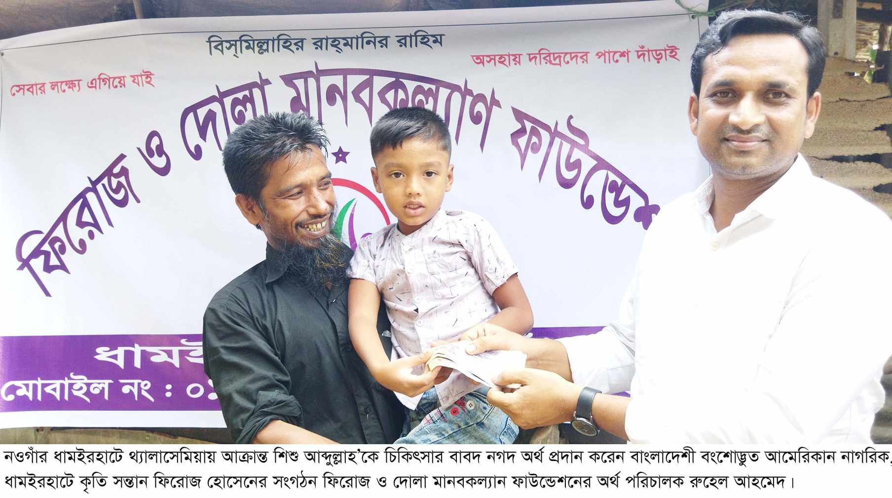 জানা গেছে, থ্যালাসেমিয়ায় আক্রান্ত হওয়ায় শিশু আব্দুল্লাহ’র এর মা তার সংসার জীবনে ইতি টানতে হয়। মা মরিয়ম বেগম তার বাবা মহিদুল ইসলামের সংসারে ছেলে আব্দুল্লাহর চিকিৎসার জন্য সমাজসেবা অধিদপ্তর সহ বিভিন্ন সহযোগিতায় ছেলেকে চিকিৎসা চালিয়ে যাচ্ছিলেন। সম্প্রতি অর্থ সংকটে অসুস্থ্য আব্দুল্লাহ’র খবর জানতে পেরে ধামইরহাটের কৃতি সন্তান বাংলাদেশী বংশোদ্ভুত আমেরিকান নাগরিক ফিরোজ হোসেনের নির্দেশনায় ভুক্তভোগীর বাড়ী পূর্ব শালুককুড়ি গ্রামে ছুটে যান ফিরোজ ও দোলা মানবকল্যান ফাউন্ডেশনের অর্থ পরিচালক মো. রুহেল আহম্মেদ ।