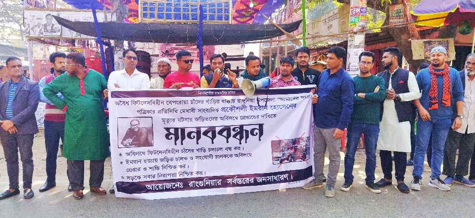 ২ জানুয়ারি (মঙ্গলবার) রাঙ্গুনিয়া উপজেলার গোডাউন চত্বরে আয়োজিত এক মানববন্ধন ও প্রতিবাদ সমাবেশ থেকে অবৈধ, ফিটনেসবিহীন চাঁদের গাড়ির দৌরাত্ম বন্ধ ও নিরাপদ সড়ক নিশ্চিতে প্রশাসনের হস্তক্ষেপের আহবানও জানিয়েছেন তারা।