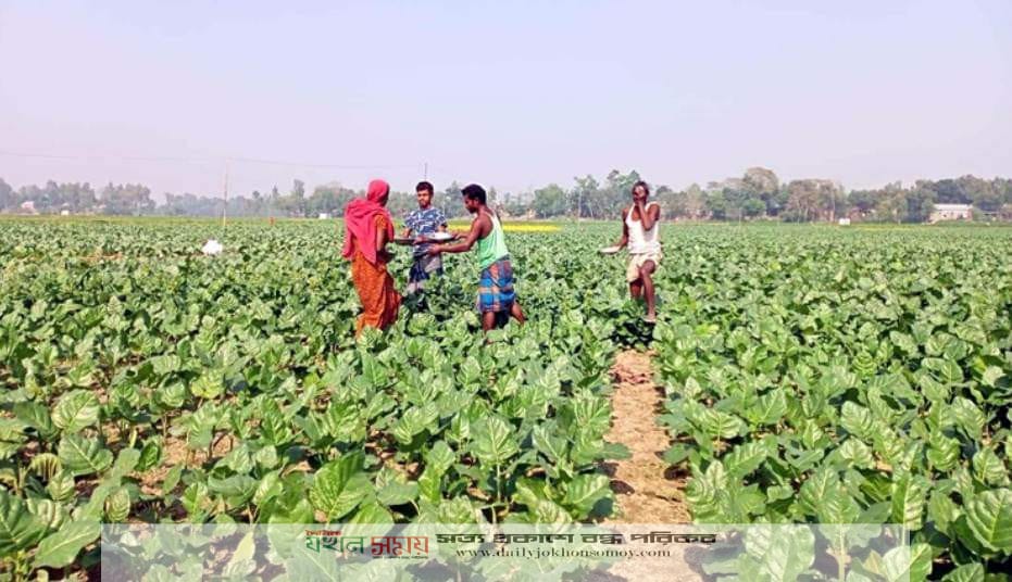 সরেজমিনে উপজেলার শেখ সাদী, রৌমারী বিল এলাকায় দেখা যায়, বিস্তীর্ণ এলাকাজুড়ে তামাক খেত। কেউ তামাক গাছের পরিচর্যা করছেন, কেউ তামাক গাছের ছোট পাতা কাটছেন, আবার সার খেতে দিচ্ছেন কেউ।