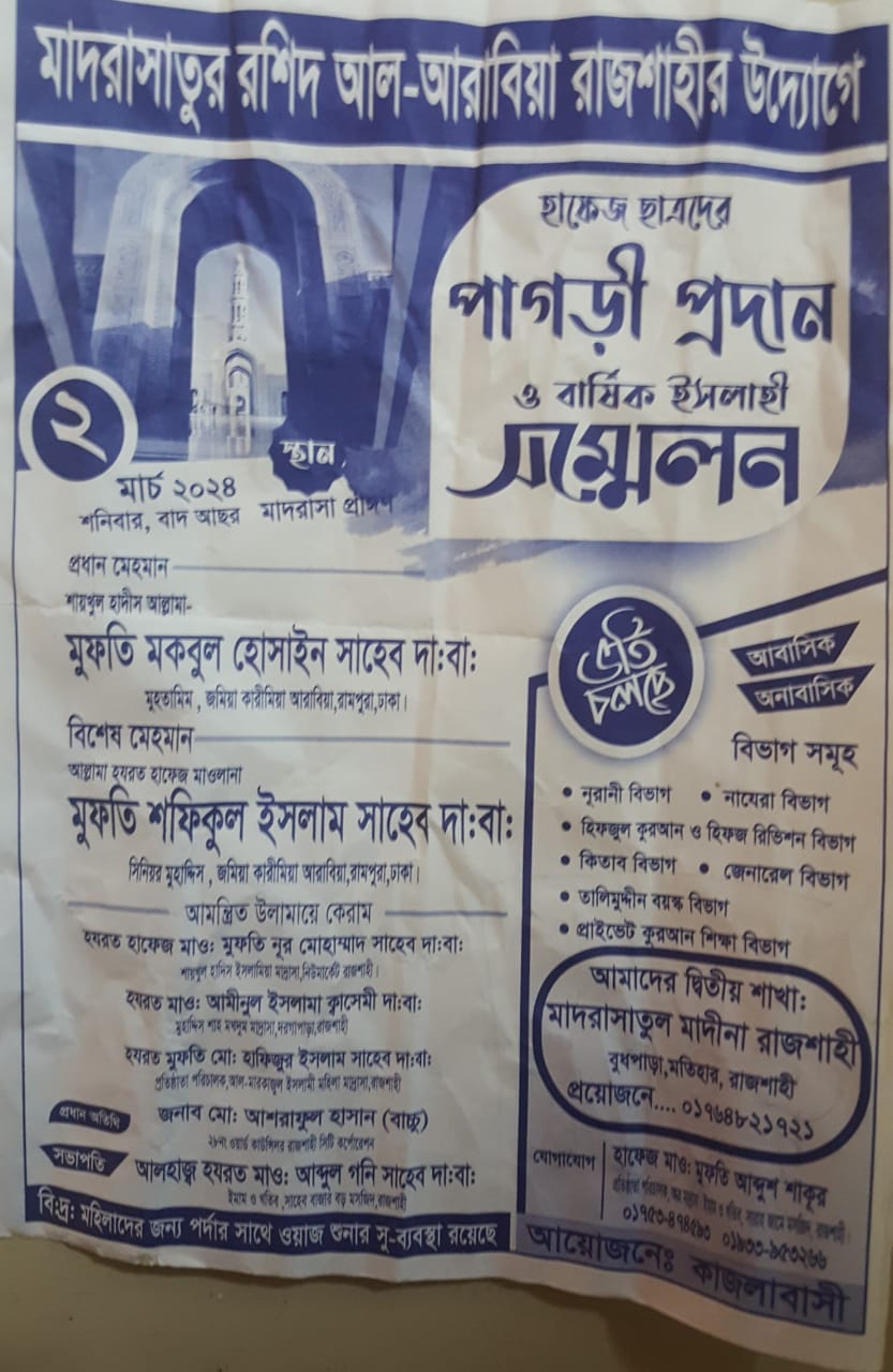 মোঃ মারজুক রহমান রিদয় রাজশাহী মহানগর প্রতিনিধিঃ মাদরাসাতুর রশিদ আল-আরাবিয়া রাজশাহীর উদ্যোগে আজ ২ মার্চ ২০২৪ শনিবার হাফেজ ছাত্রদের পাগড়ী